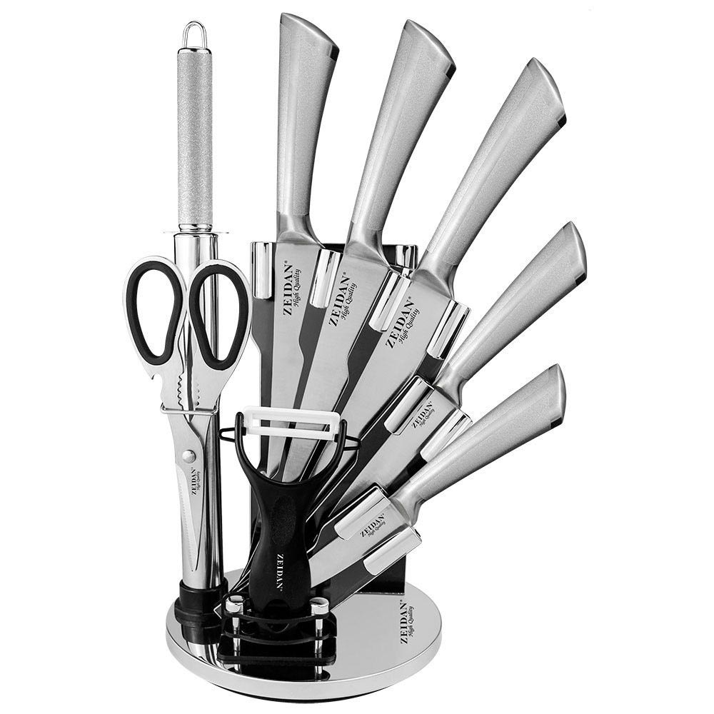 Набор ножей состоит из 9 предметов на складной подставке из акрила.