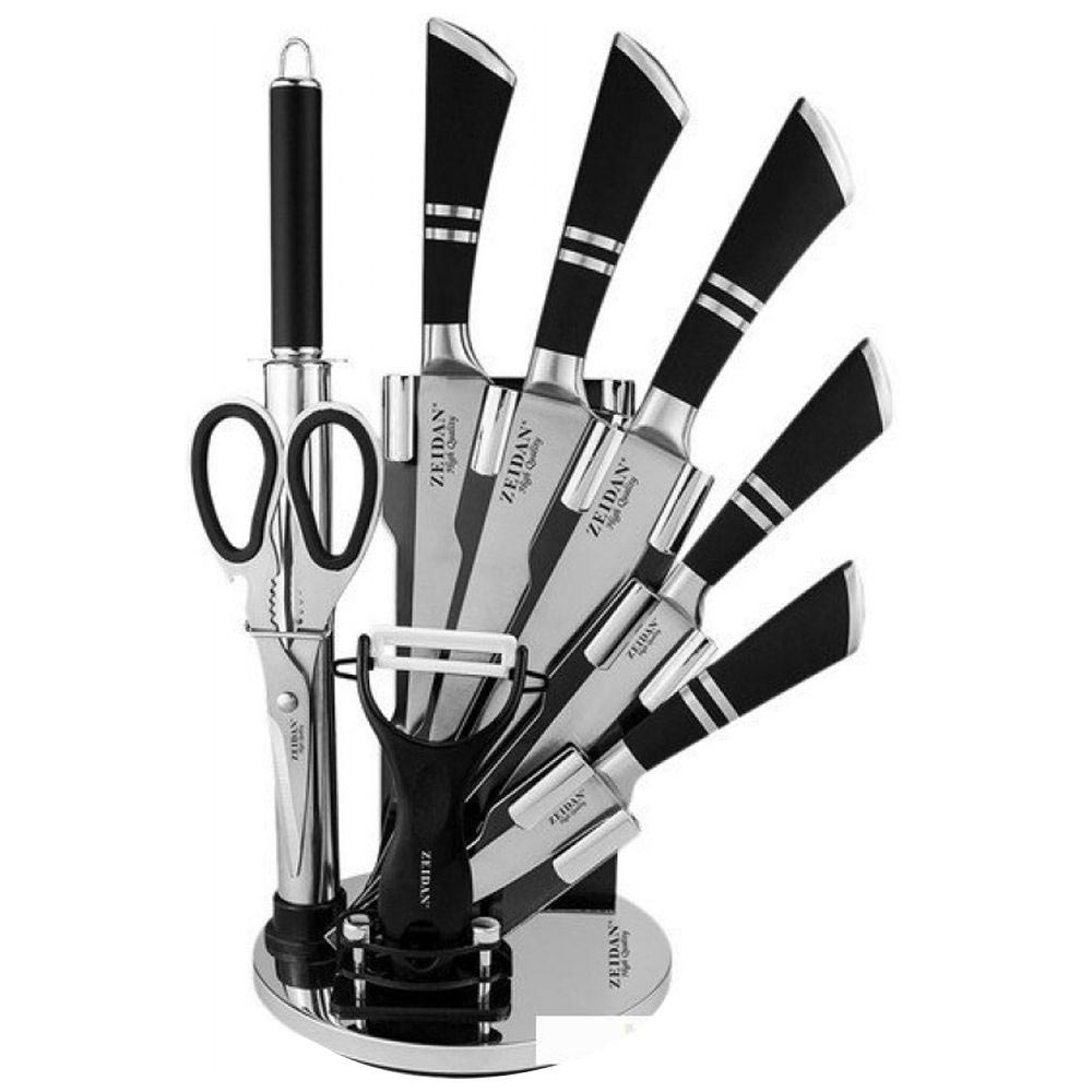Набор ножей состоит из 9 предметов на складной подставке из акрила.
