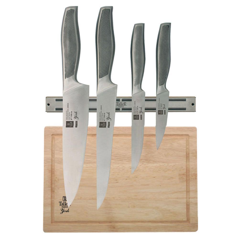 Ножи из набора имеют лезвия на 10, 14, 20,5 и 24 см. Как и ножи, магнитный держатель окрашен в серебристый цвет.