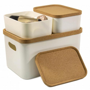 Набор состоит из 3 органайзеров с крышками: одного большого объемом 2.4 л и двух маленьких объемом 0,76 л. Крышки сделаны из экологически чистого, безопасного и возобновляемого материала – коры пробкового дерева.