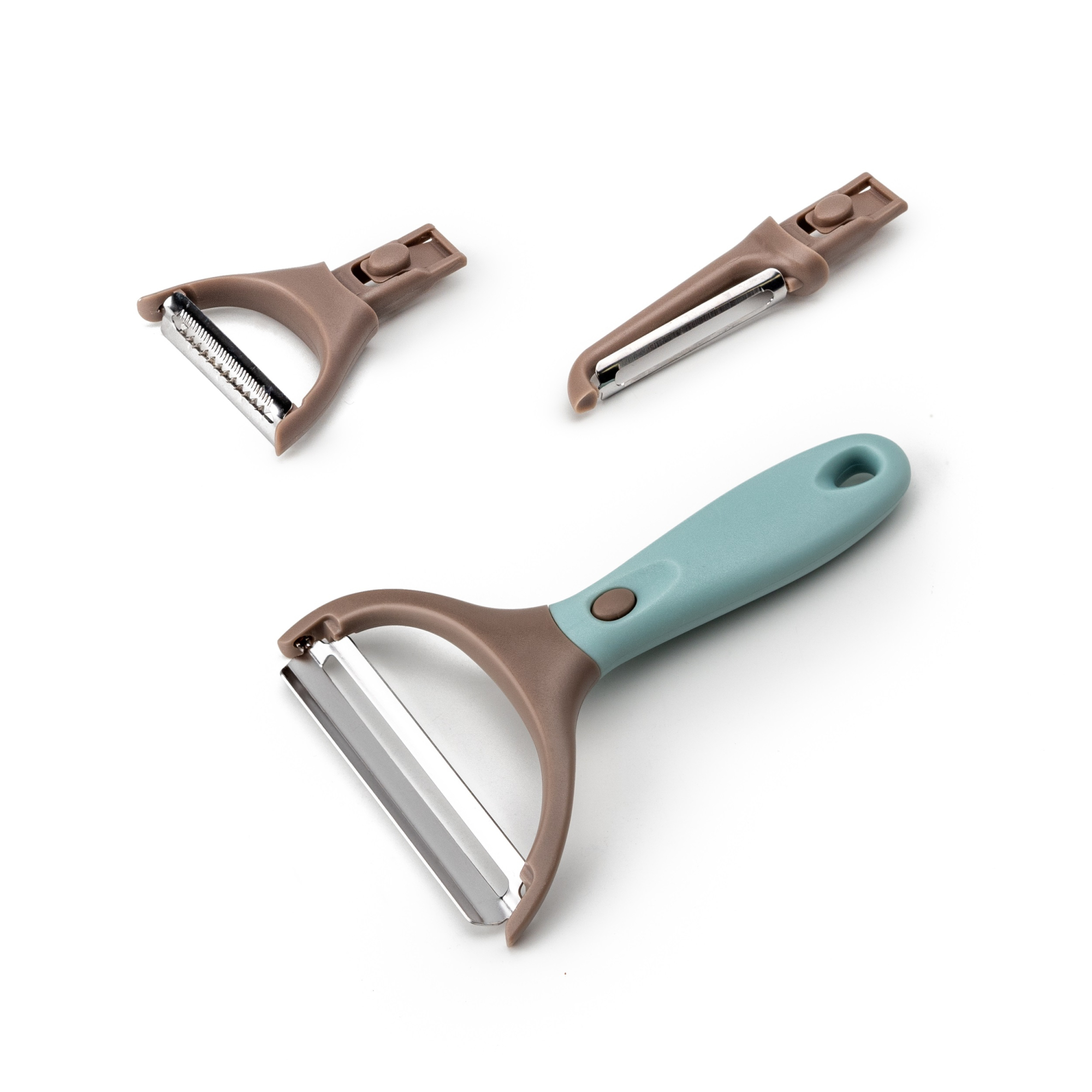 Набор овощечисток со съемной ручкой и острым, прочным лезвием позволяет легко и тонко очищать овощи и фрукты. Пластиковая ручка удобно лежит в руке, исключая соскальзывание и риск порезов. Подходит для мытья в посудомоечной машине.
