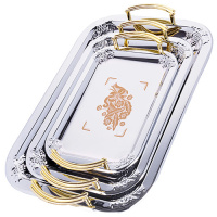 Набор из трех сервировочных подносов разного размера, изготовленных из нержавеющей стали с зеркальной полировкой, станет незаменимым предметом для сервировки стола. Они имеют прямоугольную форму и оформлены декоративными элементами и ручками золотистого цвета. Подносы отлично подойдут для подачи рыбных блюд, а традиционные блюда будут выглядеть на них более аппетитно. Благодаря оригинальному дизайну сервировочные подносы придадут элегантный вид любому обеденному столу. Современный стильный дизайн и функциональность позволят подносам занять достойное место на Вашей кухне.