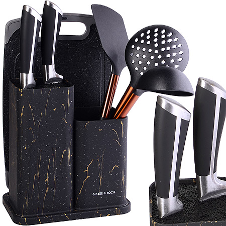 Универсальная подставка Mayer&Boch позволит хранить ножи и ножницы любой формы, вне зависимости от их формы и лезвия. Корпус подставки выполнен из пластика, что делает её гигиеничной и долговечной, покрыт нескользящим слоем soft-touch. Уникальный внутренний наполнитель состоит из тонких и гибких полипропиленовых стержней, которые легко моются. При необходимости наполнитель свободно вынимается и моется в посудомоечной машине. Полипропилен является экологически чистым материалом, устойчивым к истиранию, высокой температуре и химическому воздействию.Имеет два отсека: для ножей и столовых приборов, а так же в наборе разделочная доска. Подставка для ножей MAYER&BOCH станет прекрасным подарком, а ее яркий дизайн станет украшением Вашей кухни.