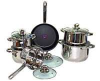 Объемы кастрюль: 1,7 л (диаметр - 16 см), 2,5 л (диаметр - 18 см), 3,5 л (диаметр - 20 см), 6 л (диаметр - 24 см). Объем ковша - 1,7 л, диаметр - 16 см. Объем сковороды - 2,6 л, диаметр - 24 см.