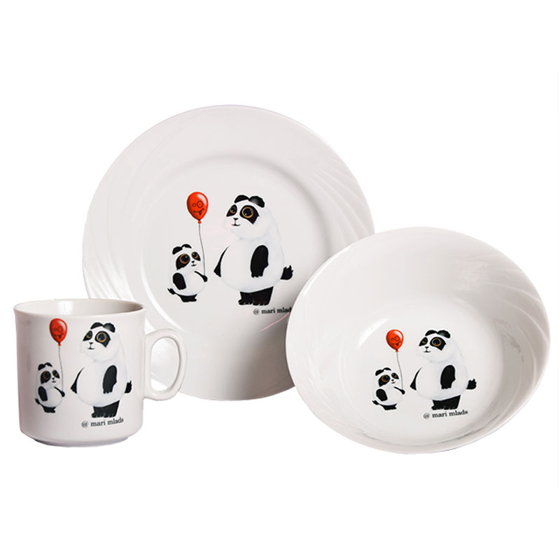 Набор детской посуды "Панда" состоит из кружки объемом 200 мл, глубокой тарелки диаметром 200 мм (360 мл) и мелкой тарелки 175 мм с забавными детскими рисунками. Данная посуда изготавливается из особых сортов белой глины и абсолютно безопасна для здоровья вашего ребенка.