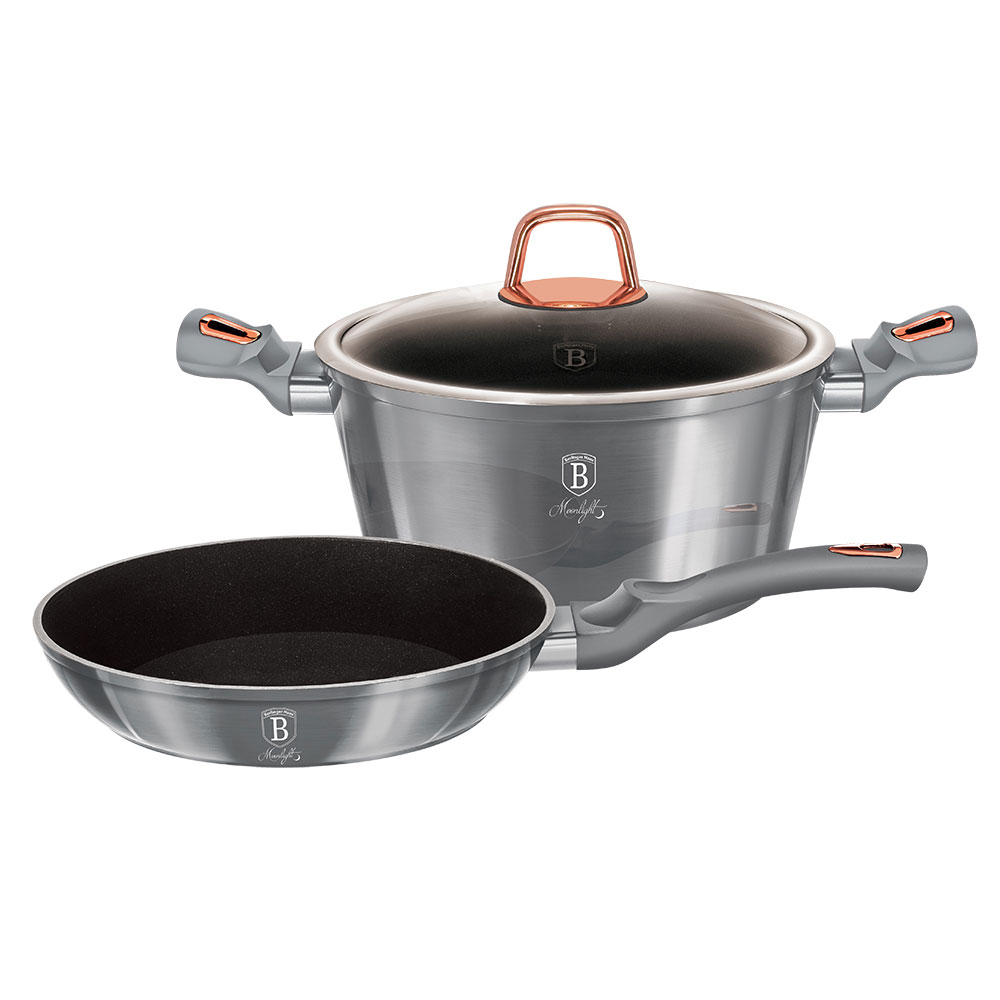 Набор посуды "Moonlight Edition" из кованого алюминия состоит из кастрюли и сковороды. Эргономичные ручки имют покрытие "soft touch".