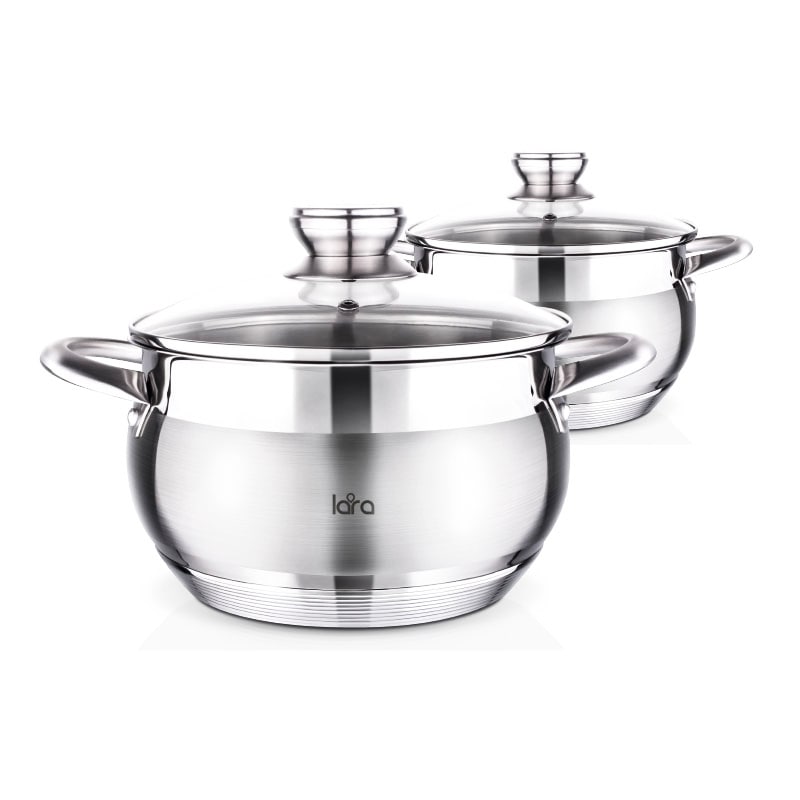 Набор кастрюль из нержавеющей стали подойдет для использования на газовых, чугунных, стеклокерамических, галогеновых, индукционных конфорках.