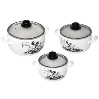 Покрытие посуды состоит из трех слоев стеклоэмали голландской фирмы Ferro. Эмалевое покрытие, являясь по сути своей стекольной массой, надежно защищает пищу от контакта с металлом, не вступает в реакцию с продуктами и не искажает их вкус. Стеклоэмаль – долговечный гипоаллергенный материал, подходит для приготовления блюд диетического и детского питания.