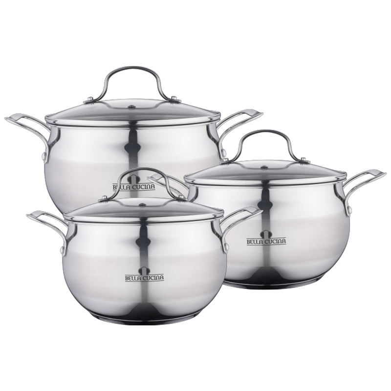 Набор кастрюль из нержавеющей стали со стеклянными крышками.