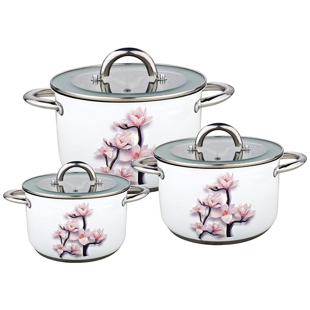 В комплект входят три, различные о объему, кастрюли с крышками.