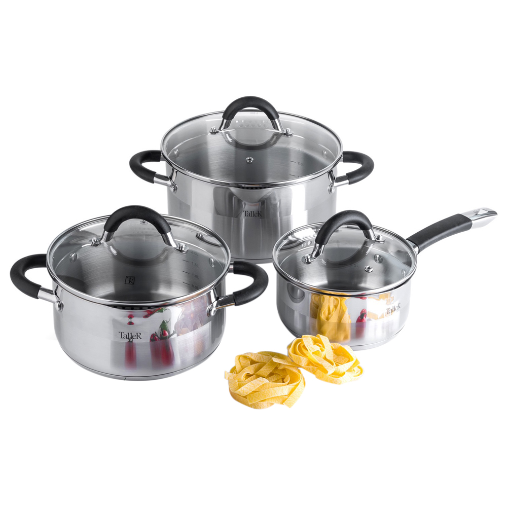 Толщина стенки - 0,6 мм, толщина дна - 2,8 мм. Полировка внешнняя - комбинированная, внутренняя - матовая. Крышка из жаропрочного стекла с отверстием для выхода пара и широким металлическим ободком с отверстиями для слива жидкости. Форма края кастрюли предусматривает желобок для удобного слива жидкости. Ручки из нержавеющей стали с силиконовыми вставками на клепках. Есть отметки литража.