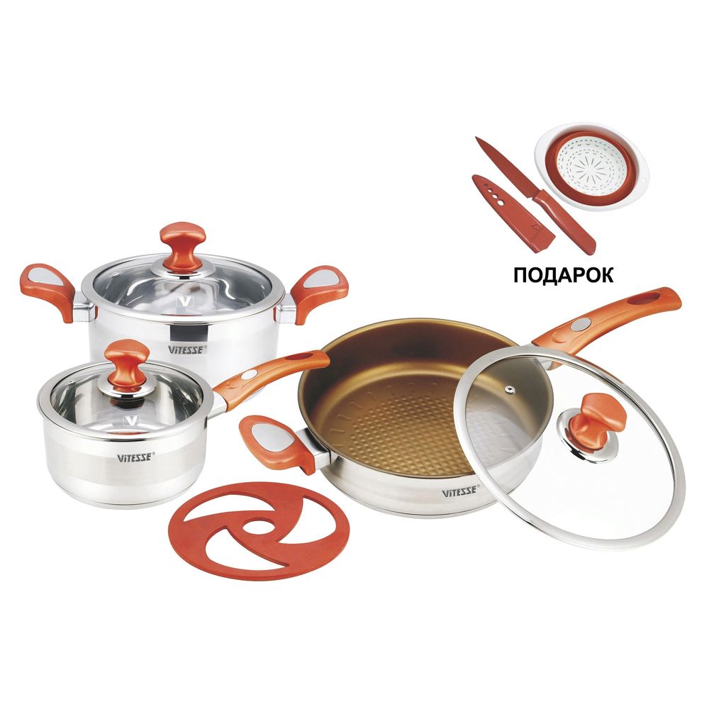 В комплекте: нож с покрытием Non-Stick в чехле и складной силиконовый дуршлаг.