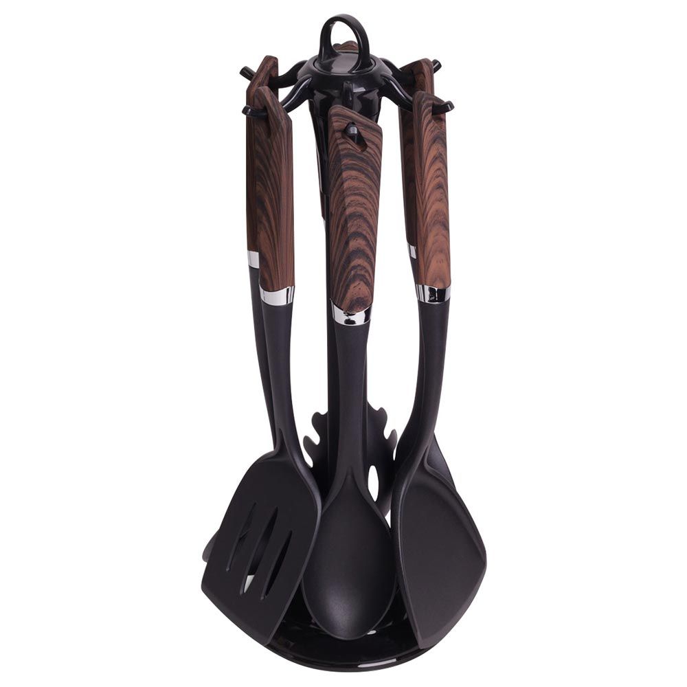 В набор входит: половник, поварская ложка с отверстиями, лопатка, поварская ложка, лопатка с отверстиями, ложка для пасты, подставка.