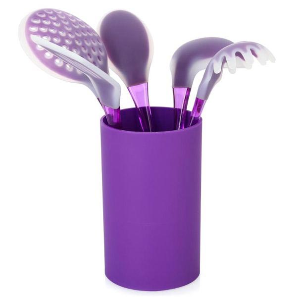 Набор половников включает в себя ложку для спагетти, лопатку с прорезями, ложку для помешивания, шумовку, половник и подставку. Приборы изготовлены из цветного полистирола и силикона, отличаются высокой износоустойчивостью и надежностью, не окисляются со временем и не портят вкус продуктов, кроме того, они абсолютно безопасны для любых антипригарных покрытий. Входящая в набор удобная высокая подставка для хранения предметов набора поможет сэкономить место на рабочем столе.