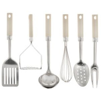 Приборы выполнены из высококачественной нержавеющей стали. Нержавеющая сталь идеально подходит для приготовления пищи, она не окисляется со временем и не портит вкус ваших блюд. Изделия снабжены длинными эргономичными нескользящими ручками из пластика цвета слоновой кости, которые защитят Ваши руки от ожогов. Этот профессиональный набор очень удобен в использовании и имеет стильную подставку, которая впишется в любой интерьер и позволит хранить приборы в одном месте.