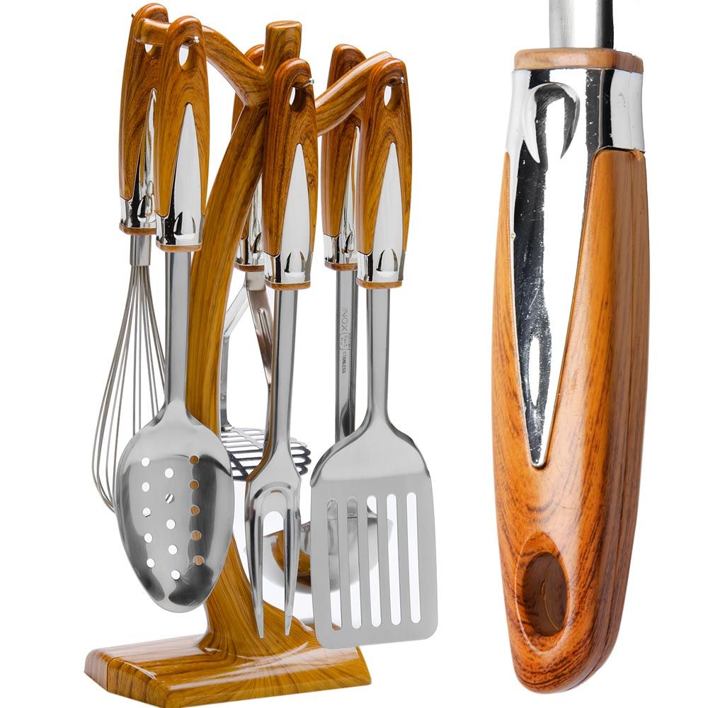 Кухонный набор Mayer&Boch очень удобен в использовании, имеет стильную подставку из пластика, стилизованного под дерево. Все предметы из набора снабжены удобными нескользящими ручками из термопластика, защищающими Ваши руки от ожогов. Высококачественная нержавеющая сталь CrNi 18/10, из которой выполнены рабочие поверхности, идеально подходит для приготовления пищи, предметы набора не окислятся со временем и не испортят вкус Ваших блюд.