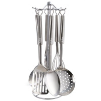 Набор Lara состоит из половника, лопатки с прорезями, шумовки, поварской ложки, поварского венчика, картофельного пресса и стенда.