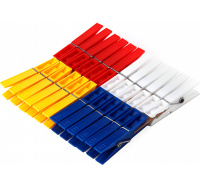 В набор входит 24 прищепки по 6 штук красного, желтого, белого и синего цвета.