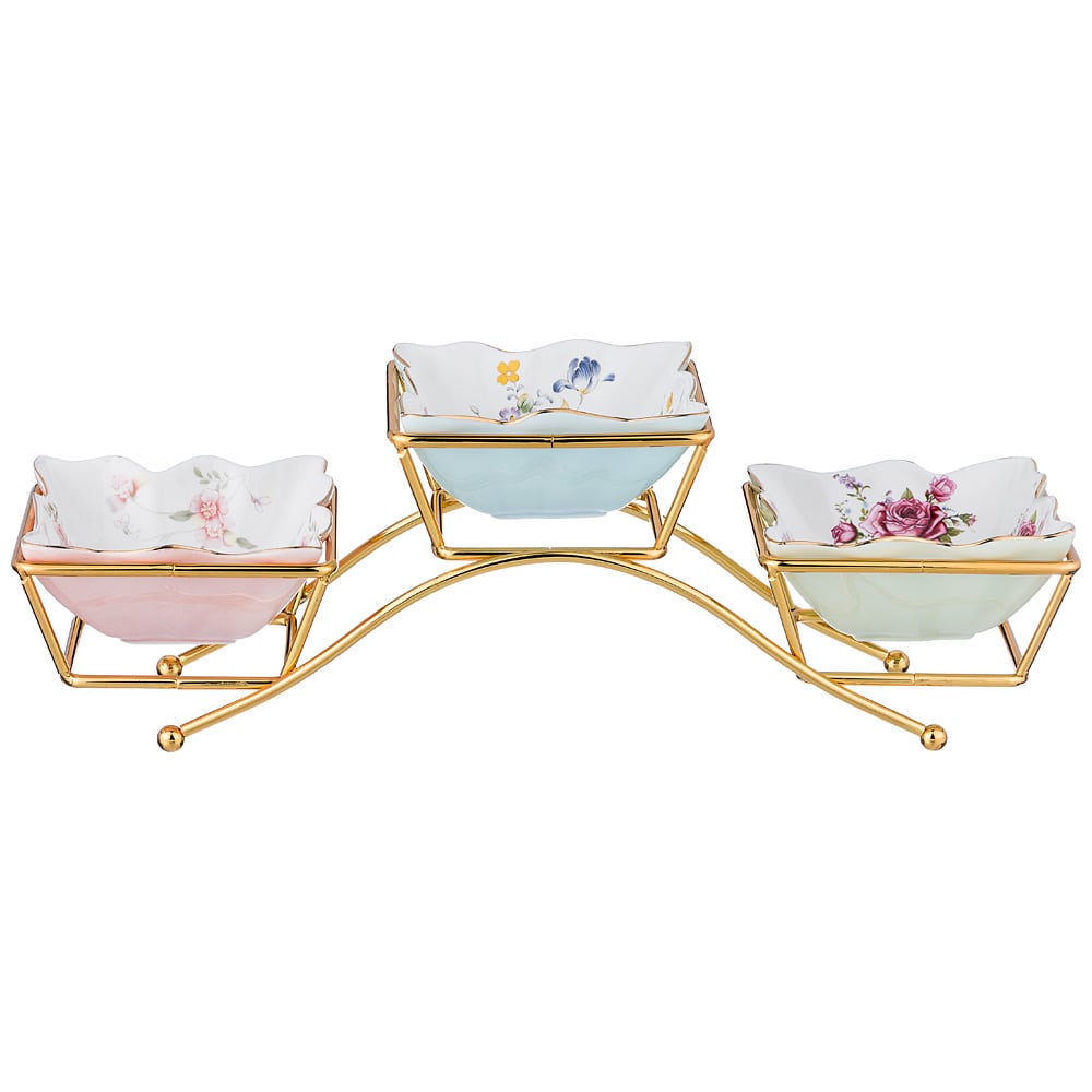 Не секрет, что любые блюда и напитки требуют определенной сервировки и красивой подачи к столу. Это позволяет вам и вашим гостям насладиться не только их прекрасным вкусом, но и получить от трапезы настоящее эстетическое удовольствие. Набор розеток "Времена года" состоит из четырех розеток, изготовленных из высококачественного фарфора, и металлической позолоченой подставки. Он отлично подойдет для подачи на стол соусов, меда или варенья.