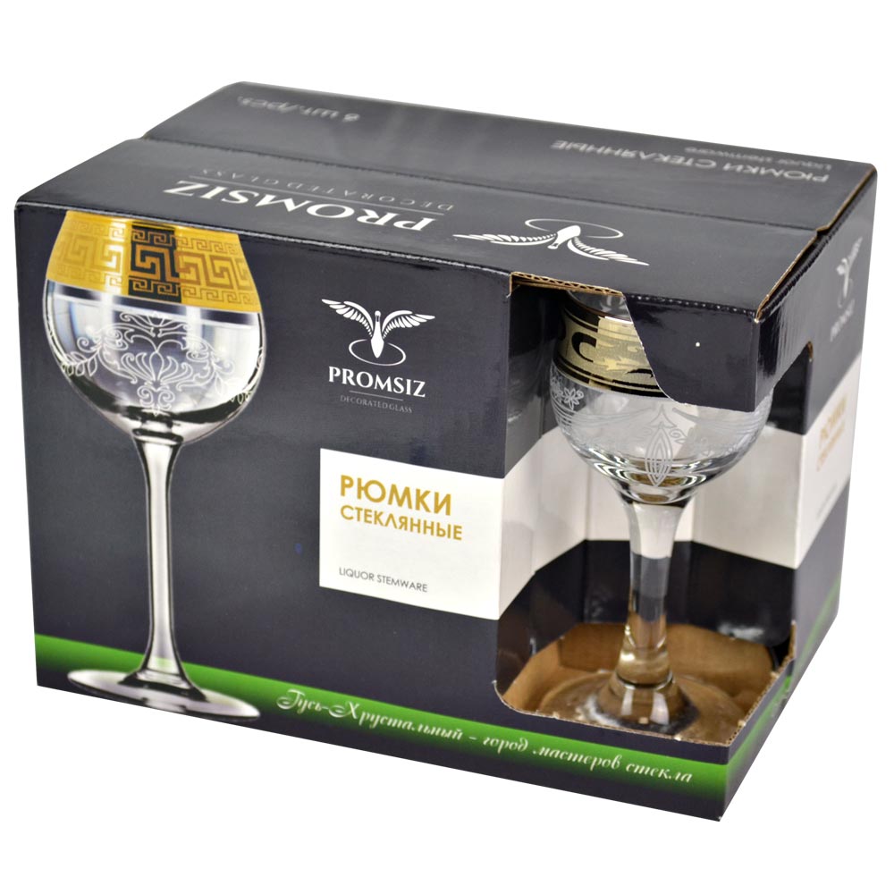 Набор рюмок "Русский узор" из бесцветного натрий-кальций силикатного стекла, декорирован по наружной поверхности металлами и глянцевыми препаратами.