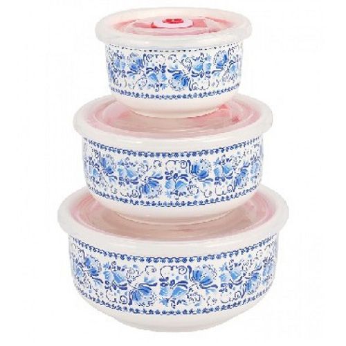 Миски снабжены плотно прилегающими вакуумными пластиковыми крышками и украшены цветочным рисунком.