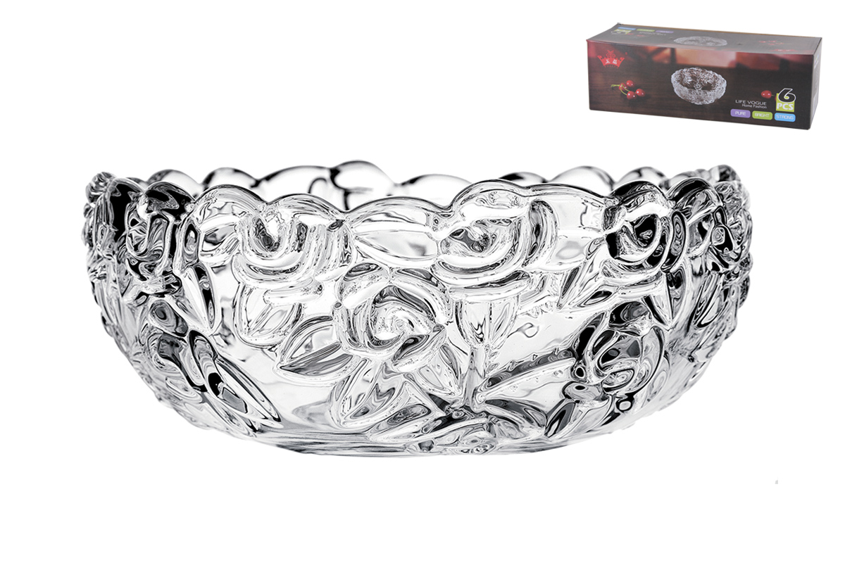 Набор включает в себя 6 салатников одинакового размера. Изделия выполнены из высококачественного бесцветного стекла и украшены художественной росписью.