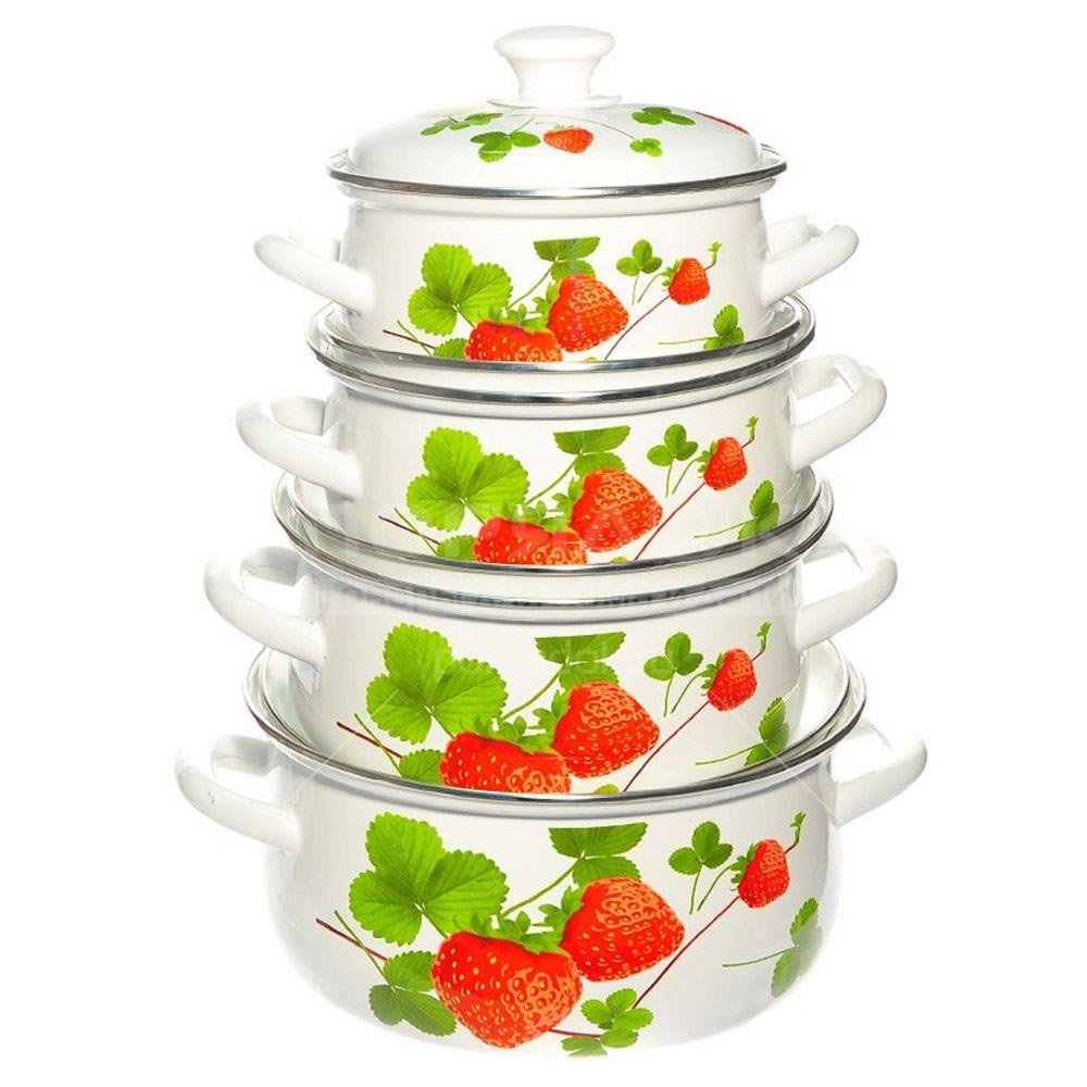 Набор "Летняя ягода - 1", состоящий из четырех кастрюль с крышками, изготовлен из высококачественной стали с эмалированным покрытием и оформлен изображением ягод.