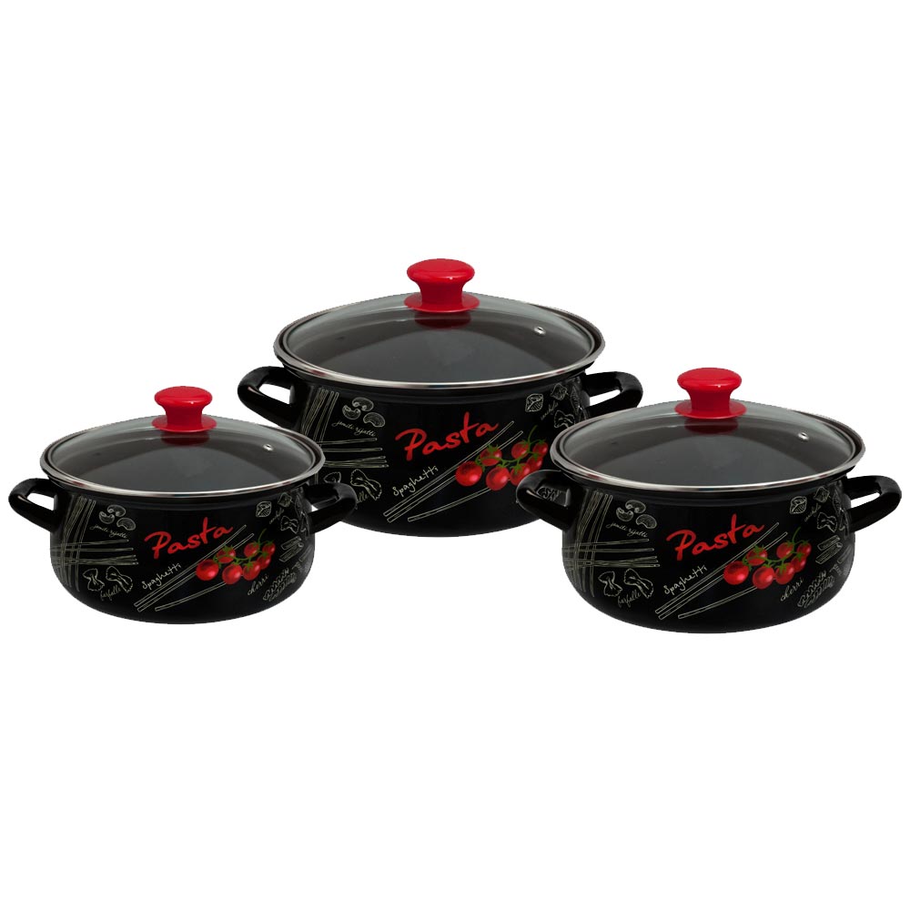 Набор кастрюль "Болоньезе" состоит из 3 кастрюль разного объема и 3 крышек. Кастрюли выполнены из качественной эмалированной стали, крышки - из стекла. Эмалированная поверхность исключает контакт пищи с металлом, тем самым безопасна для здоровья.
