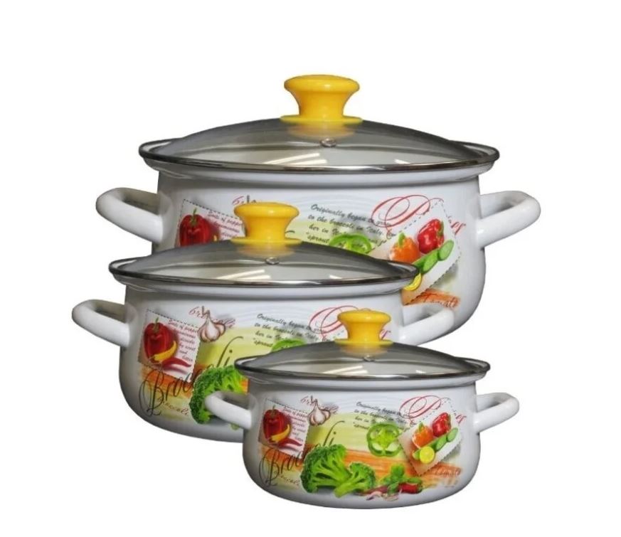 Набор кастрюль "Брокколи" (производства "КМК") изготовлен из высококачественной стали с эмалированным покрытием и оформлен изображением цветов.