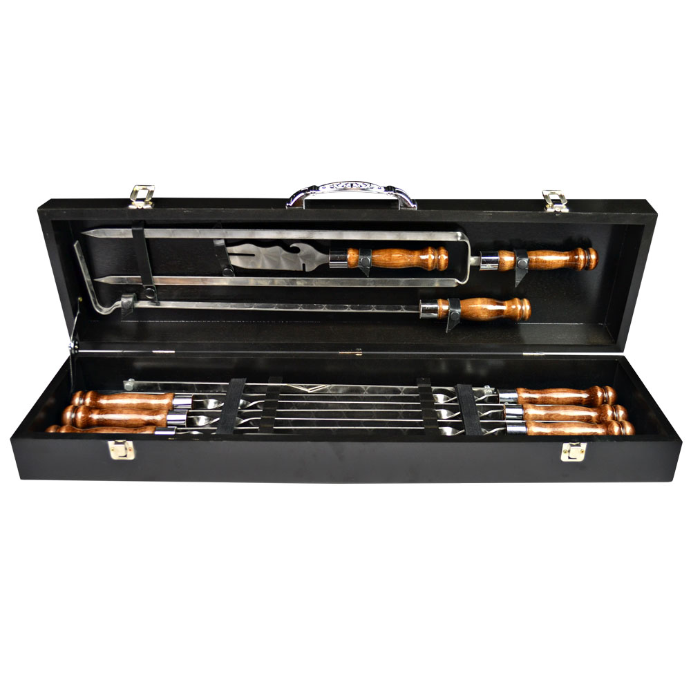 В наборе: 6 шампуров, таганок, вилка-шампур, кочерга, нож шампурный, кейс.