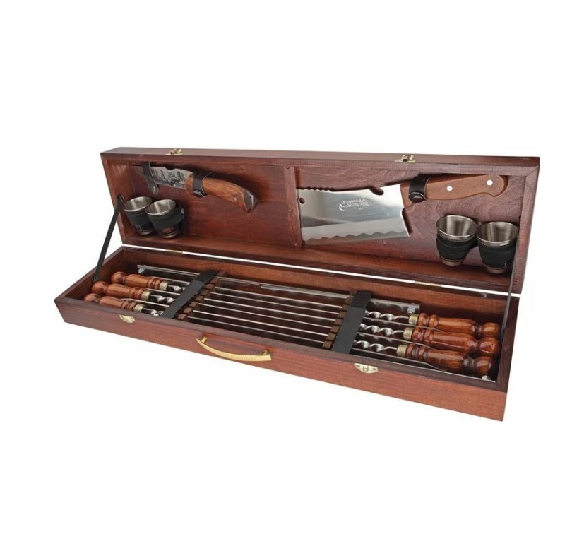 Подарочный набор с деревянном кейсе. В комплект входит 6 шампуров с деревянной ручкой, 1 таганок, 4 рюмки, 1 нож, 1 топор.