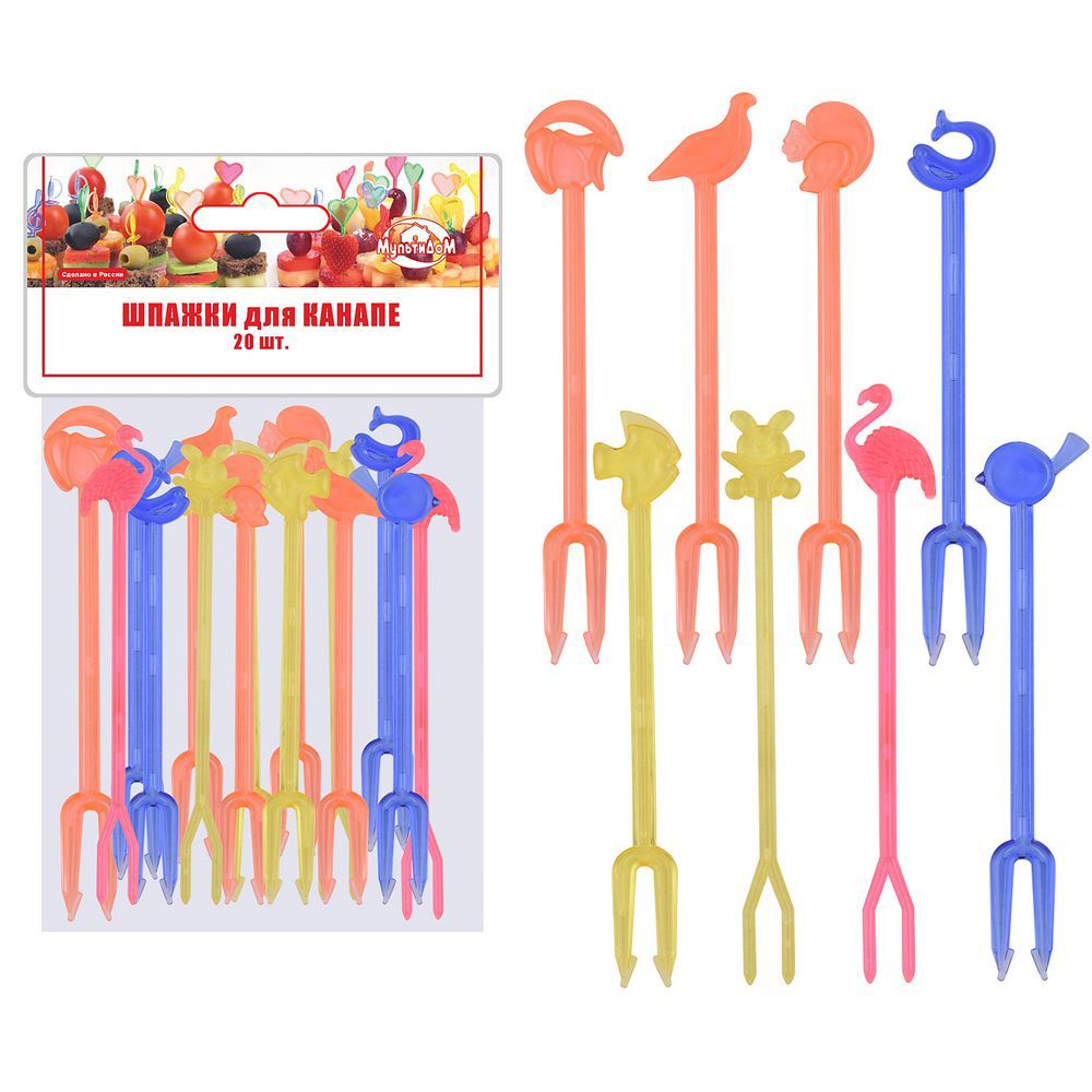 Используются при сервировке стола многослойными мини-бутербродами (канапе) из овощей, фруктов, ягод, сыров и мясных продуктов. Идеально подходят для фуршетов, вечеринок и детских праздников. Шпажки многоразового использования, заменят десертные вилочки на вашем праздничном столе, а оригинальный дизайн и яркая цветовая гамма поднимут настроение гостям.