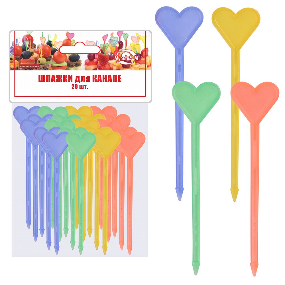 Используются при сервировке стола многослойными мини-бутербродами (канапе) из овощей, фруктов, ягод, сыров и мясных продуктов. Идеально подходят для фуршетов, вечеринок и детских праздников. Шпажки многоразового использования, заменят десертные вилочки на вашем праздничном столе, а оригинальный дизайн и яркая цветовая гамма поднимут настроение гостям.