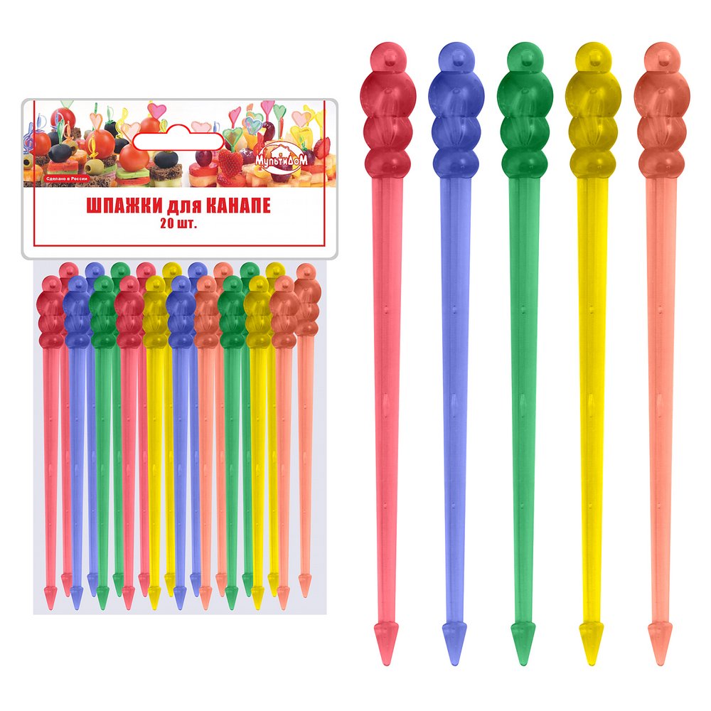 Используются при сервировке стола многослойными мини-бутербродами (канапе) из овощей, фруктов, ягод, сыров и мясных продуктов. Идеально подходят для фуршетов, вечеринок и детских праздников. Шпажки многоразового использования, заменят десертные вилочки на вашем праздничном столе, а оригинальный дизайн и яркая цветовая гамма поднимут настроение гостям.