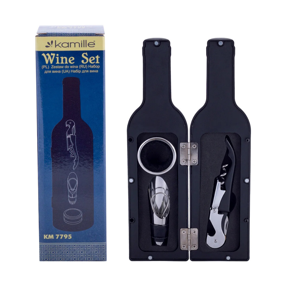 Набор сомелье для вина из 3 элементов в оригинальном чехле: штопор, кольцо против капель и дозатор.