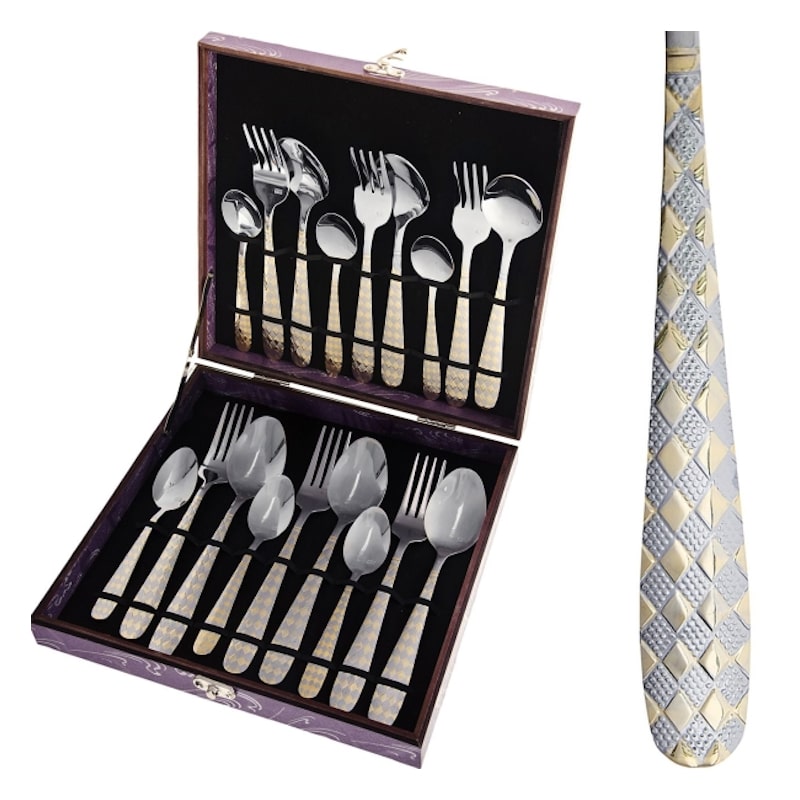 Набор столовых приборов MAYER&BOCH на 6 персон включает в себя 18 предметов: 6 столовых ложек, 6 столовых вилок, 6 чайных ложек. Столовые приборы изготавливаются из высококачественной нержавеющей стали, все изделия проходят тщательный технологический контроль. Приборы из нержавеющей стали такого состава отличаются высокими антикоррозионными свойствами, значительной устойчивостью к воздействию кислот и щелочей. Такая сталь не изменяет вкус и цвет пищи, не выделяет вредных веществ. Элегантные золотые узоры на столовых приборах выполнены по технологии плазменного напыления, обеспечивающего высокую износостойкость покрытия. Стильный, классический дизайн и отличное качество столовых приборов MAYER&BOCH делают набор желанной покупкой для любого, даже самого пристрастного, клиента. Набор столовых приборов MAYER&BOCH, безусловно, займет достойное место на любой кухне. Набор подходит как для ежедневного использования, так и для торжественных случаев. Набор упакован в красивый подарочный деревянный кейс. Подходит для мытья в посудомоечной машине.