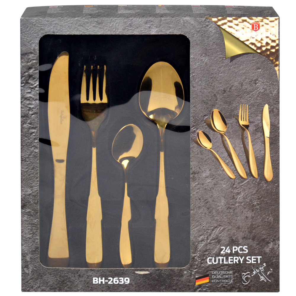 столовый нож - 6 штук, столовая вилка - 6 штук, столовая ложка - 6 штук. чайная ложка - 6 штук.