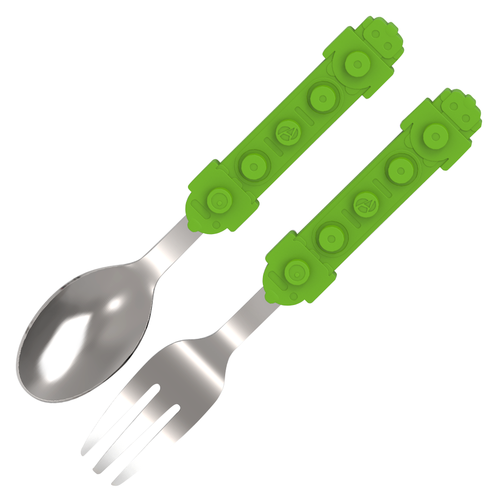 Изделия выполнены из высококачественной нержавеющей стали и силикона, ручки приборов выполнены в форме красочных деталей конструктора.