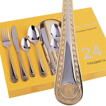Набор столовых приборов MAYER&BOCH на 6 персон выполнен из высококачественной нержавеющей стали, ручки приборов имеют глянцевую полировку и декорированы изящным золотым орнаментом. Набор из 24-х предметов включает в себя: 6 столовых ложек, 6 вилок, 6 ножей и 6 чайных ложек. Благодаря качественной полировке, изделия сохраняют прекрасный внешний вид на долгое время. Набор обладает не только оригинальным дизайном, но и практичностью, так как изделия из качественной нержавеющей стали имеют высокую прочность, устойчивость к коррозии, кроме того, нержавеющая сталь экологична, она не меняет вкусовые свойства еды, потому как не вступает в реакцию с ее компонентами. Упакованный в красочную подарочную коробку такой набор безусловно станет прекрасным подарком для любой хозяйки и украсит ваш праздничный стол. Подходит для мытья в посудомоечной машине.