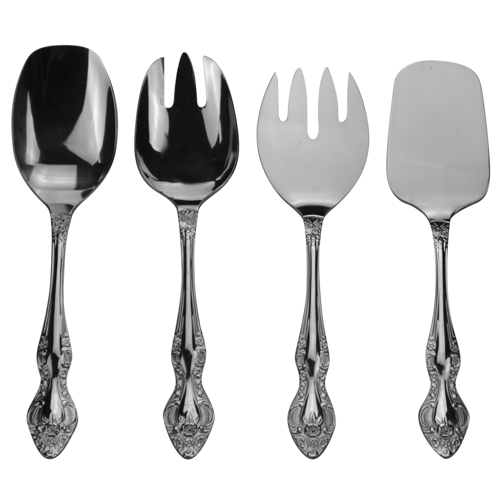 Набор "Салатный" состоит из вилки для раскладки рыбы, вилки для салата, ложки для салата и лопатки для пирожного. Изделия выполнены из нержавеющей стали с зеркальной полировкой. Ручки приборов украшены декоративным рельефным орнаментом. Такой набор прекрасно дополнит сервировку праздничного стола и порадует вас красотой и качеством исполнения.
