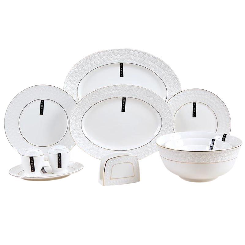 Выполненный в современном стиле набор коллекции "Снежная Королева" с классической расцветкой белого с золотом прекрасно будет смотреться на праздничном столе.