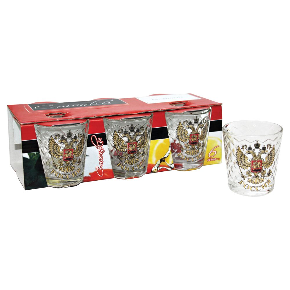 Подарочный набор серии "Герб России" - стопки с декоративным рисунком для крепких спиртных напитков (водка, граппа) и ликеров.