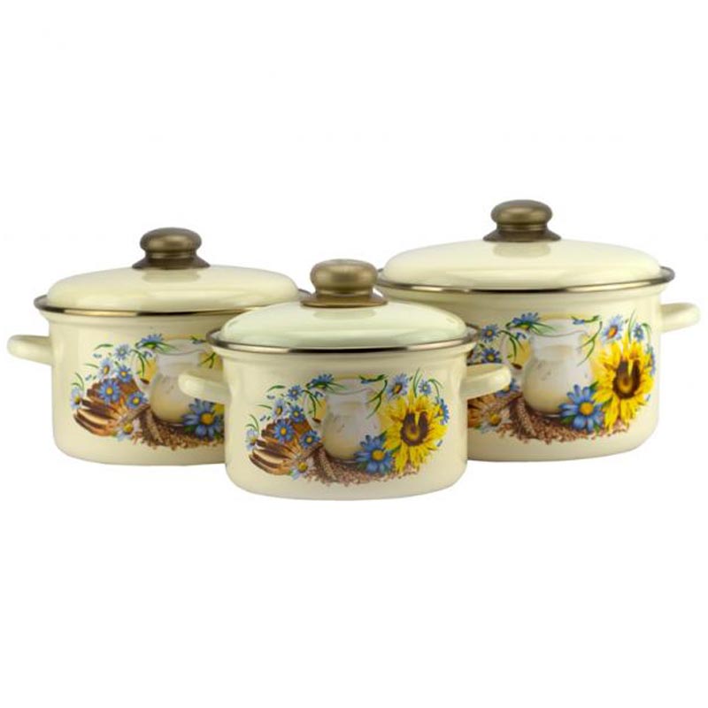 Кастрюли изготовлены из стали и покрыты эмалью. Эмалевое покрытие имеет существенные преимущества по показателям безопасности влияния на организм человека, санитарным свойствам, простоте ухода и рассчитан на длительный срок эксплуатации. Оно устойчиво к перепадам температуры до 220°С, обладает высокой механической прочностью, противостоит воздействию пищевых кислот.