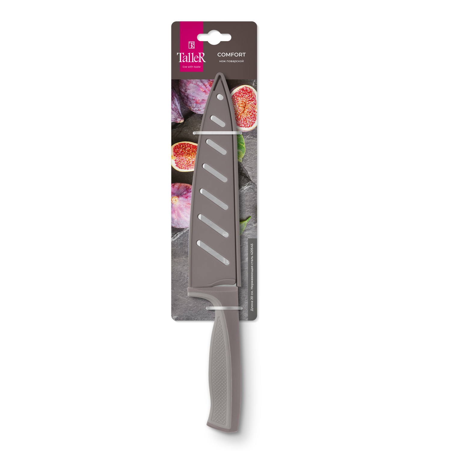 Этот нож станет вашим незаменимым помощником на кухне благодаря своей универсальности: он великолепно справляется с нарезкой, шинковкой и измельчением самых разных продуктов. В основе инструмента — лезвие длиной 20 см, шириной 4,5 см и толщиной 1,8 мм, выполненное из высококачественной коррозионностойкой стали AISI 420S45 (3Cr13), что гарантирует остроту и долговечность. Продуманная эргономичная рукоять из ударопрочного пластика дополнена мягкой силиконовой вставкой нежного бежевого цвета, которая обеспечивает надежный и комфортный хват, полностью исключая выскальзывание даже во время интенсивной работы. Основной цвет рукояти — благородный коричневый. В комплекте с ножом идет чехол из твердого безопасного пластика (PP) в тон рукояти, который обеспечивает безопасное хранение и позволяет без опасений брать инструмент с собой в поход, на пикник или на дачу. Для поддержания идеальной остроты лезвия рекомендуется использовать точилки или аналогичные, а также точильные камни и мусаты. Чтобы продлить срок службы инструмента, предпочтительна ручная мойка.