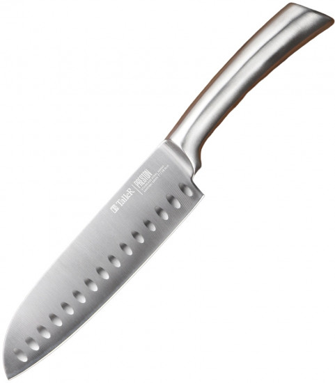 Нож сантоку TalleR Preston подходит для нарезки мяса, рыбы, овощей и других целей. Толщина лезвия - 2,5 мм. Ширина лезвия - 4,5 см. Лезвие ножей сделано из высококачественной коррозионностойкой стали AISI 420S45. Ручка выполнена из нержавеющей стали. Используйте для заточки точилки TalleR или аналогичные. Рекомендуется ручная мойка.