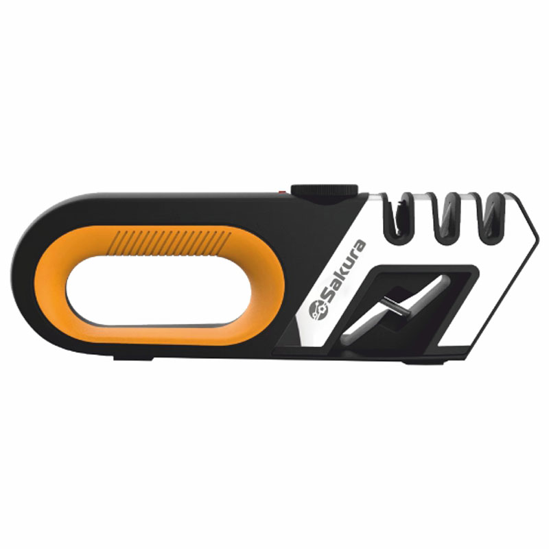 Универсальная ножеточка, 3 слота для заточки: вольфрамовая сталь (подготовка, правка), с алмазным покрытием (заточка, исправление повреждений), с керамическим покрытием (полировка, шлифовка), дополнительный слот для заточки ножниц, регулировка угла заточки для слота из вольфр.стали, нескользящее основание, прорезиненная ручка.