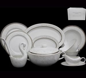 Утонченный обеденный сервиз Серый шелк изготовлен из костяного фарфора и декорирован светло-серым растительным орнаментом. По краям каждого предмета сервиза расположен изысканный серебряный кант. Сервиз Серый шелк не останется без внимания за праздничным столом, и будет эффектно смотреться в любой сервировке.
