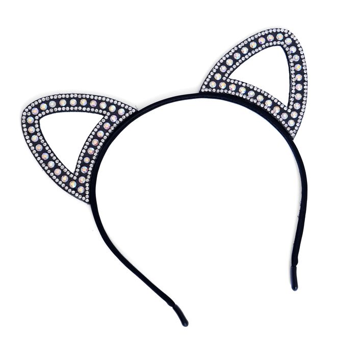 Ободок ч25565 с белыми камнями и кошачьими ушками. Он превратит даже самый простой костюм в интересный и веселый. Понравятся как маленьким девочкам, так и тем, кто постарше. Отличный аксессуар для любого праздника.
