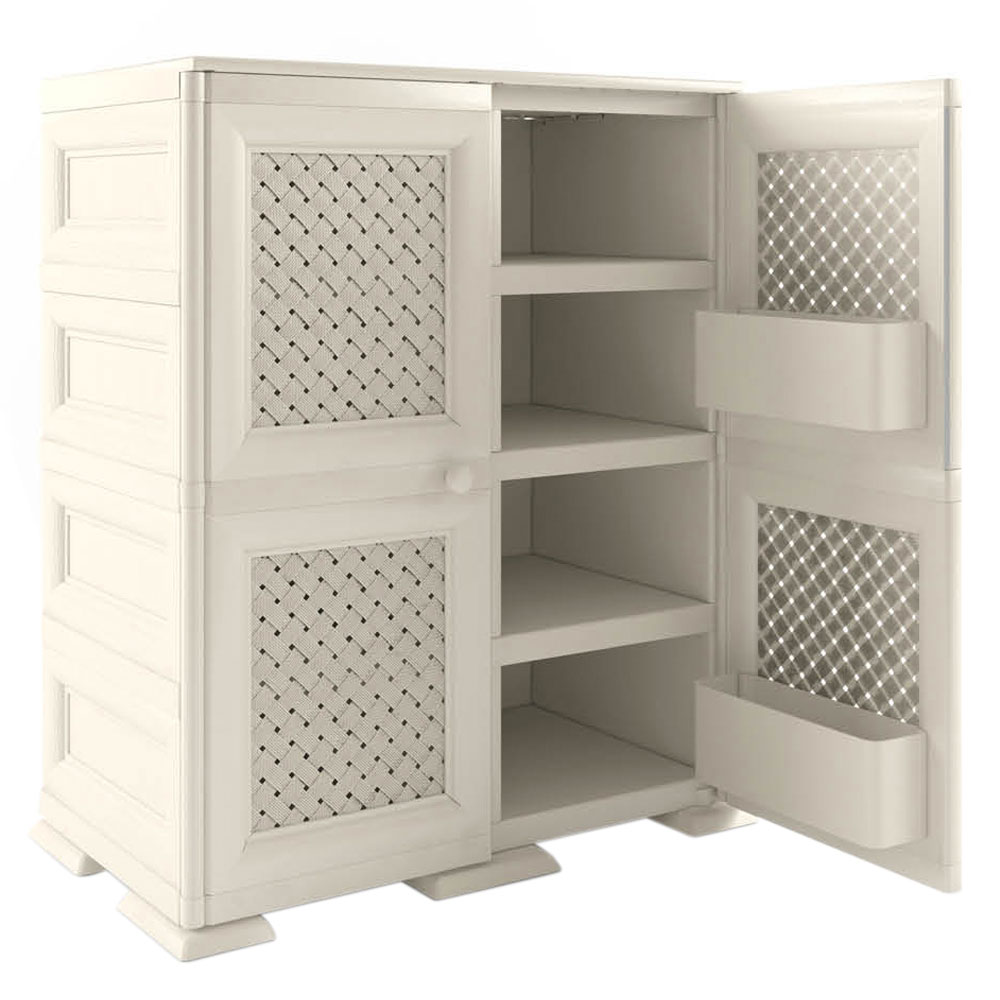 Фасады декорированы декоративным узором Сетка, имеют отверстия для естественной вентиляции. Дверцы распашные, в закрытом состоянии держатся благодаря магнитам.