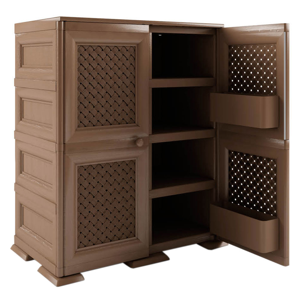 Фасады декорированы декоративным узором Сетка, имеют отверстия для естественной вентиляции. Дверцы распашные, в закрытом состоянии держатся благодаря магнитам.